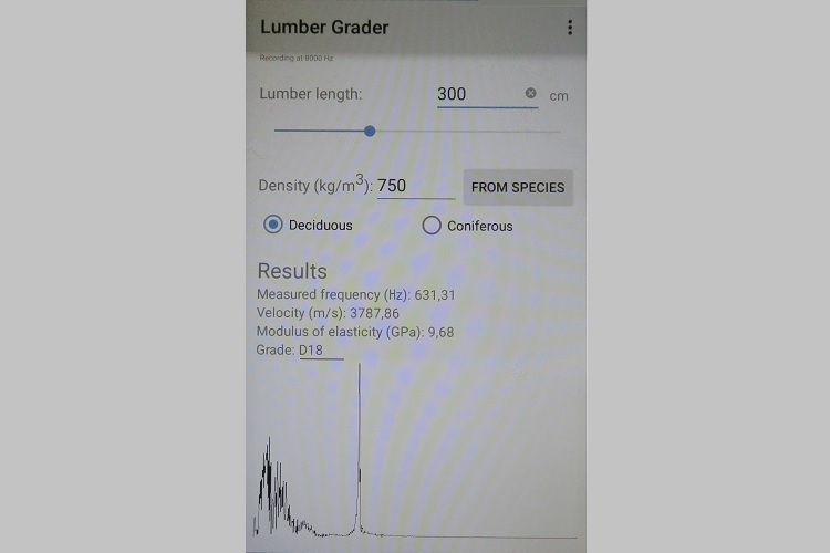 共振木材分級計是一個簡單的工具。它由一把錘子和一個帶有專門軟件的Android手機或平板電腦組成。用戶輸入長度、選擇樹種,木材分級計將采用該樹種的平均密度,用于可以覆蓋已有的密度值。然后敲擊木材的端部基于EUROCODE338標準的分級即顯示在屏幕上。由于密度的不確定性,該分級僅作為參考信息。